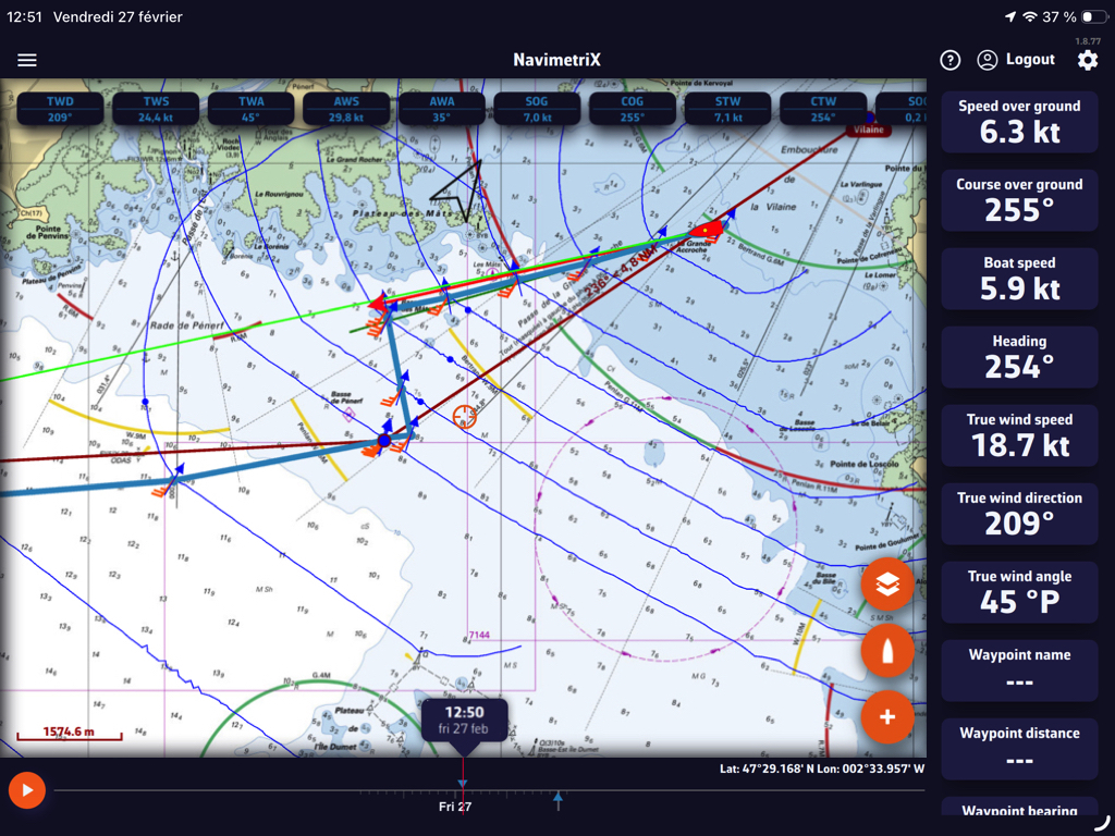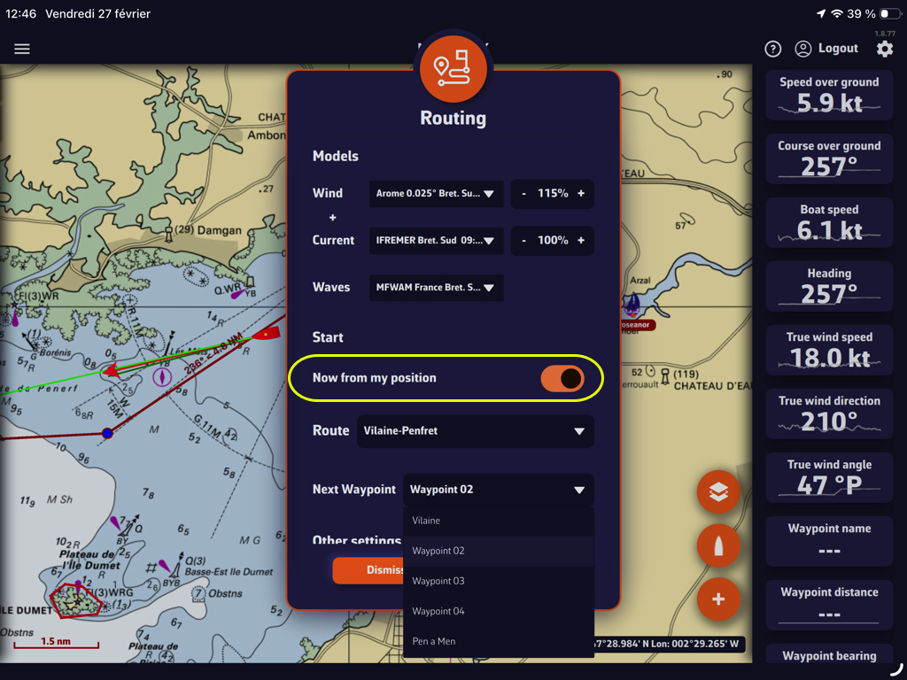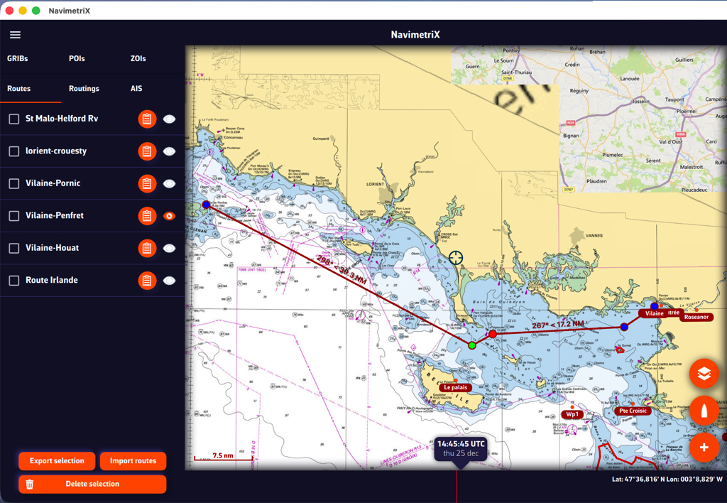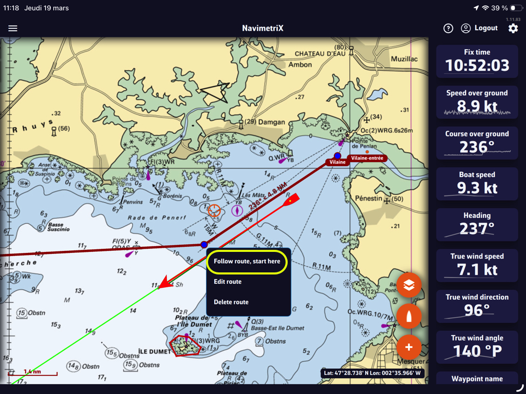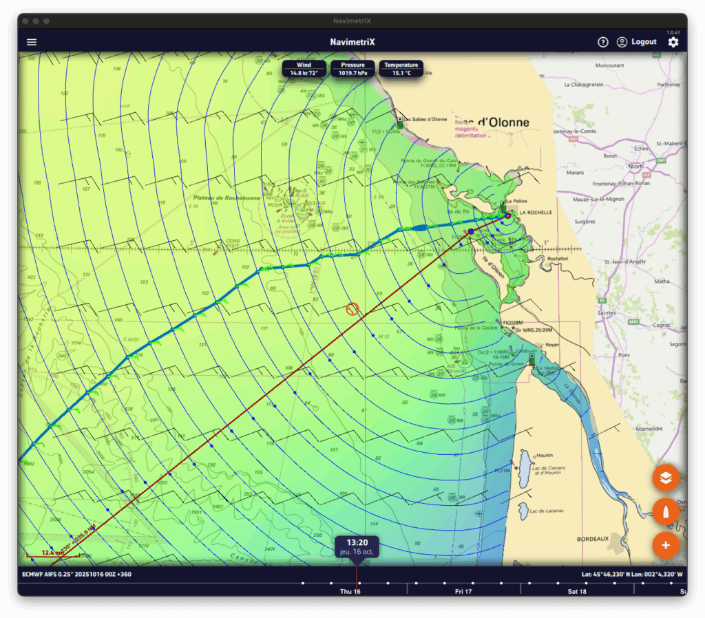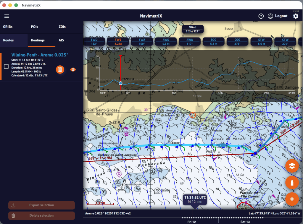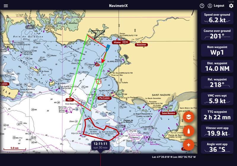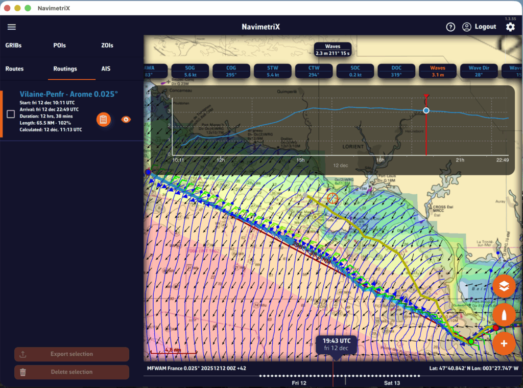 - If a routing is displayed, the boat moves at the selected time along its trajectory.