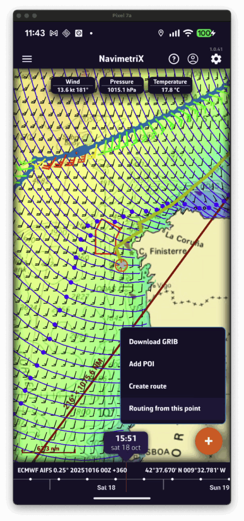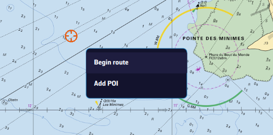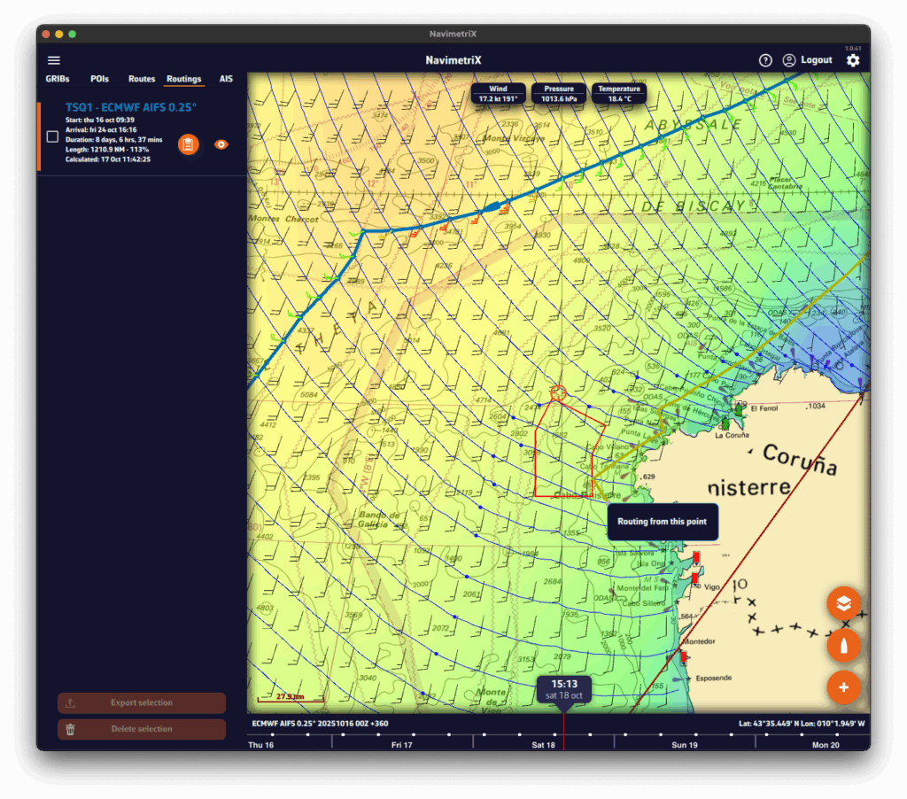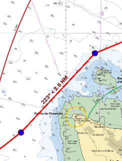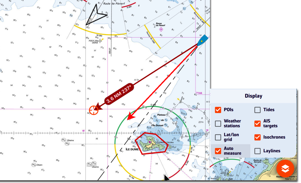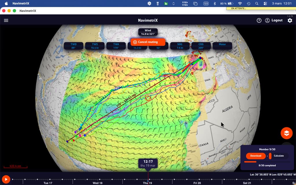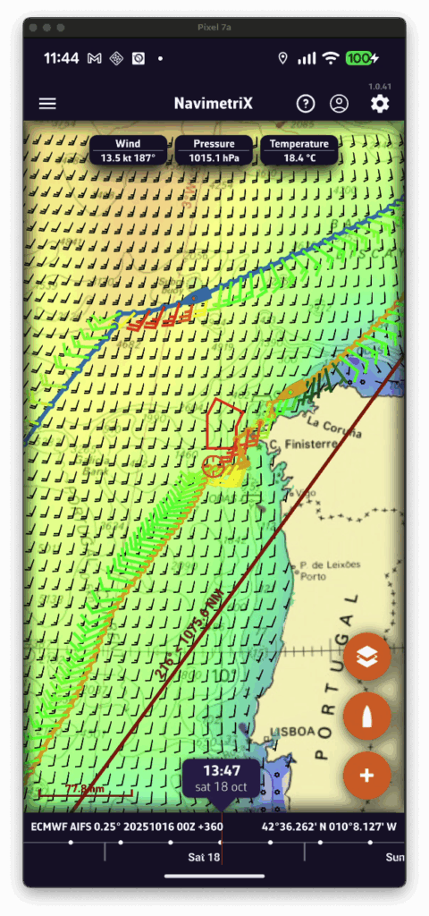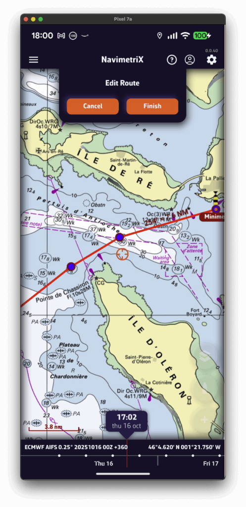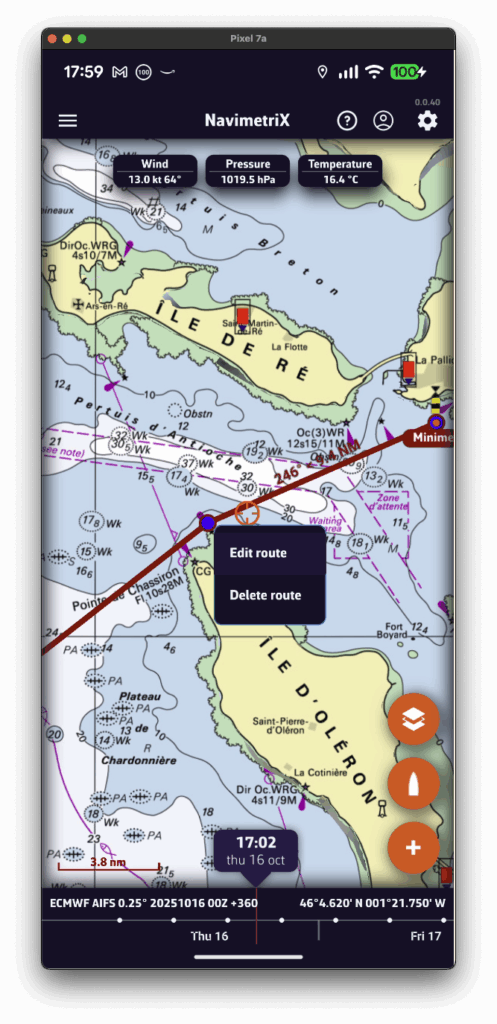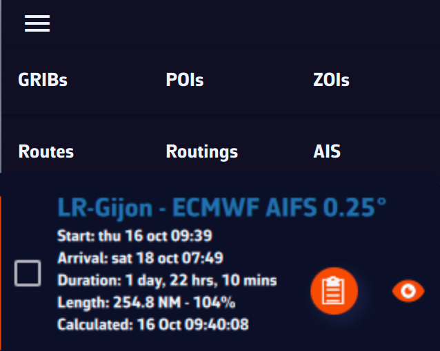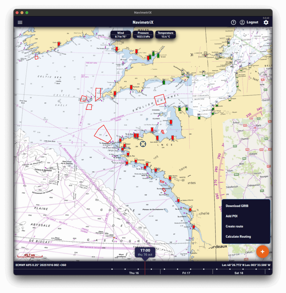 - If a routing is displayed, the boat moves at the selected time along its trajectory.