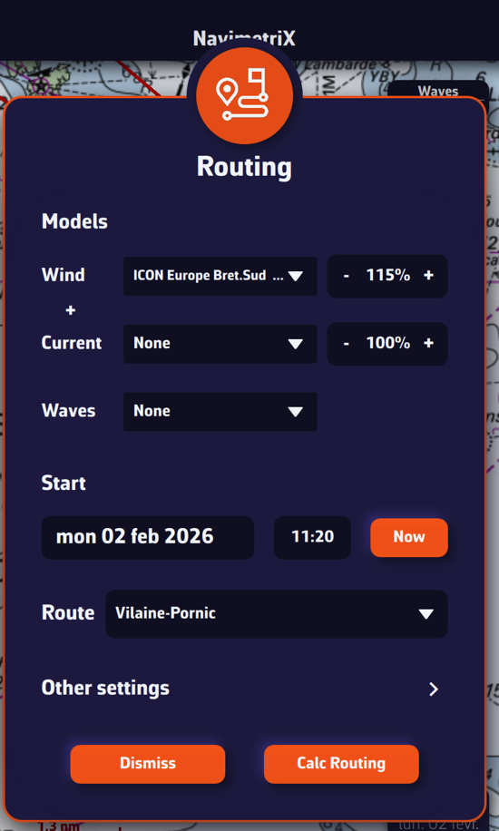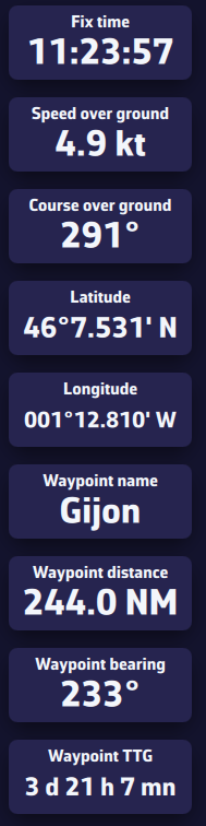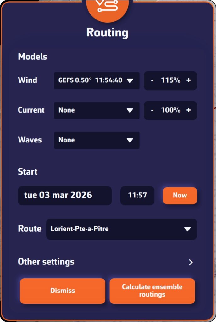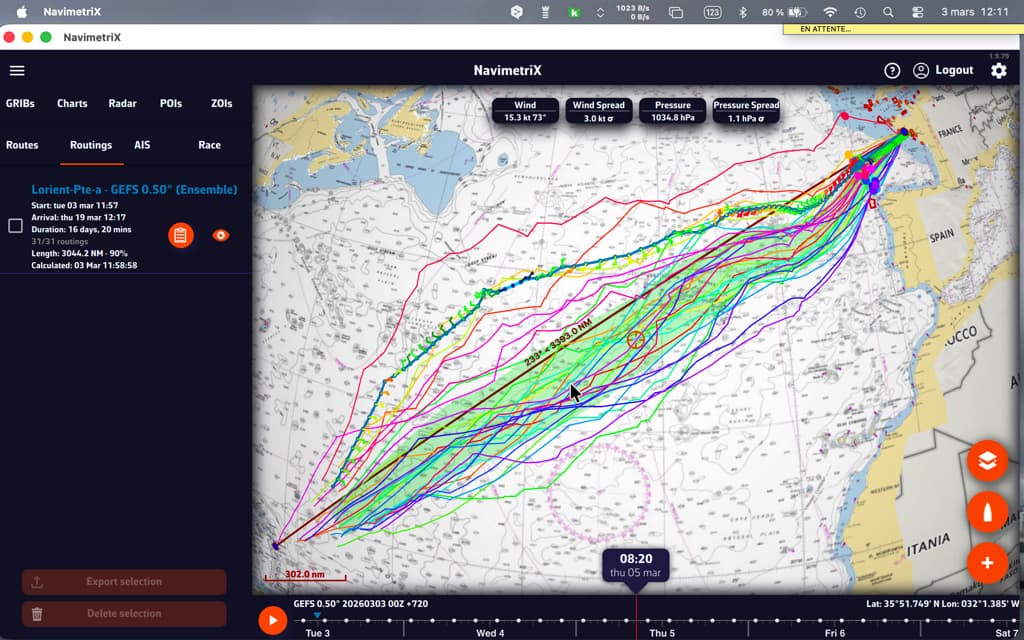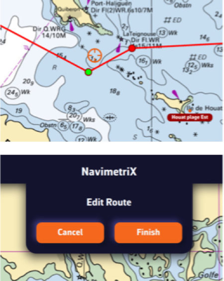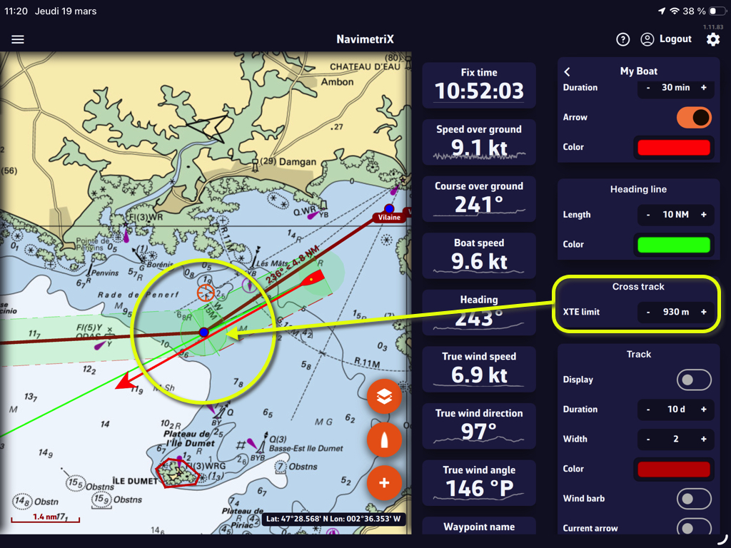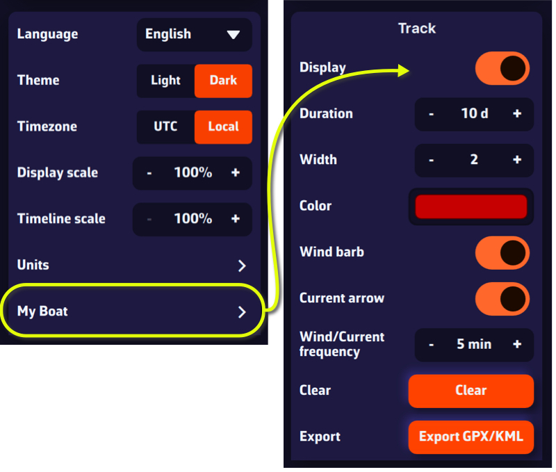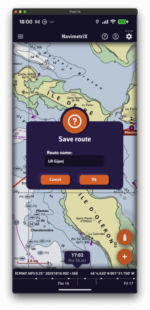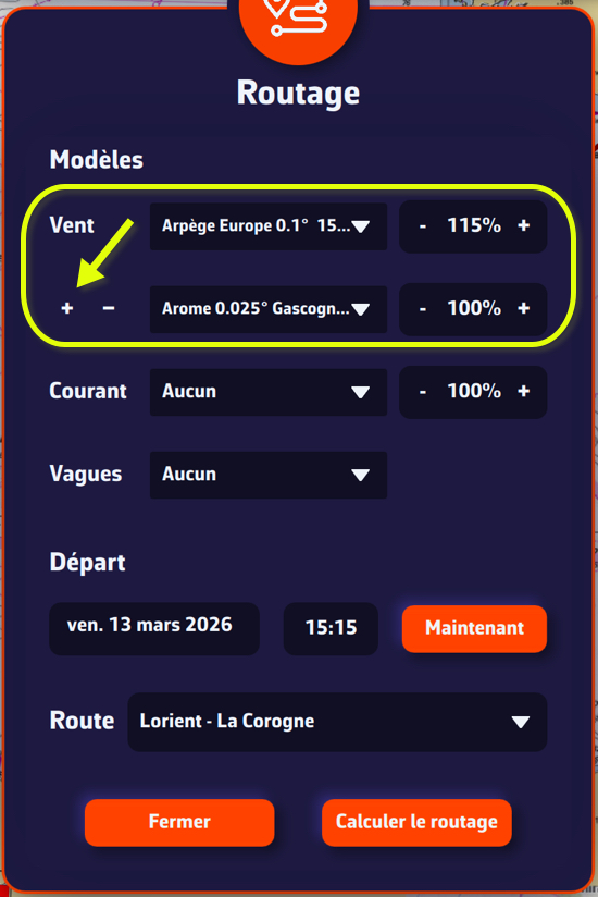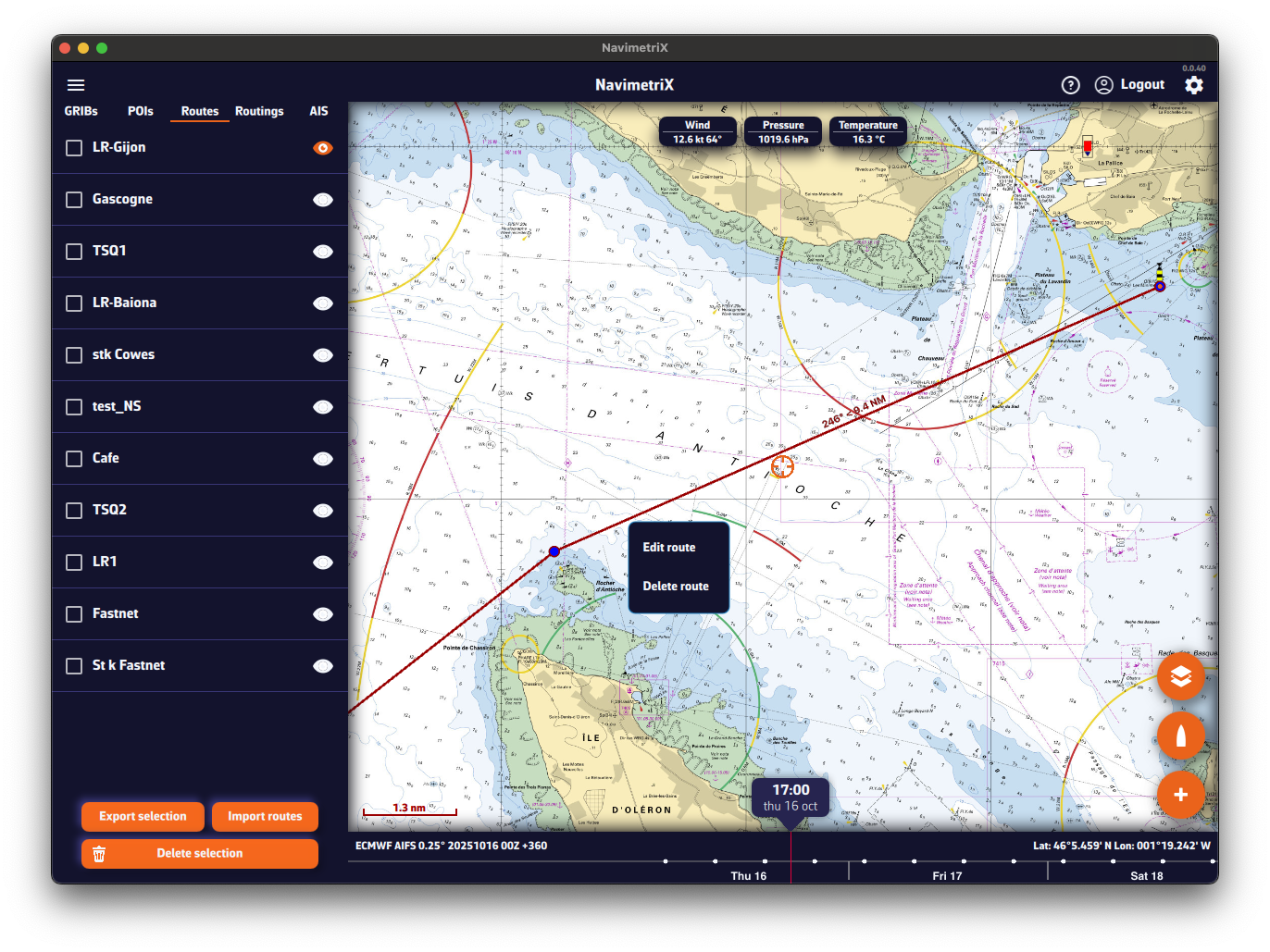 - If a routing is displayed, the boat moves at the selected time along its trajectory.