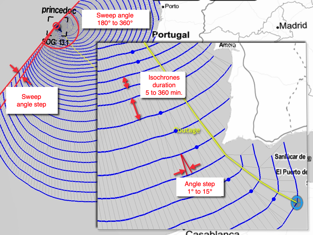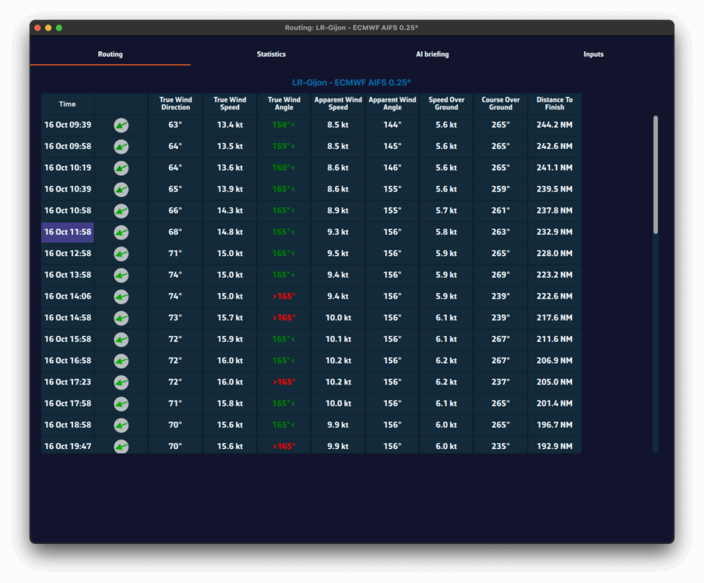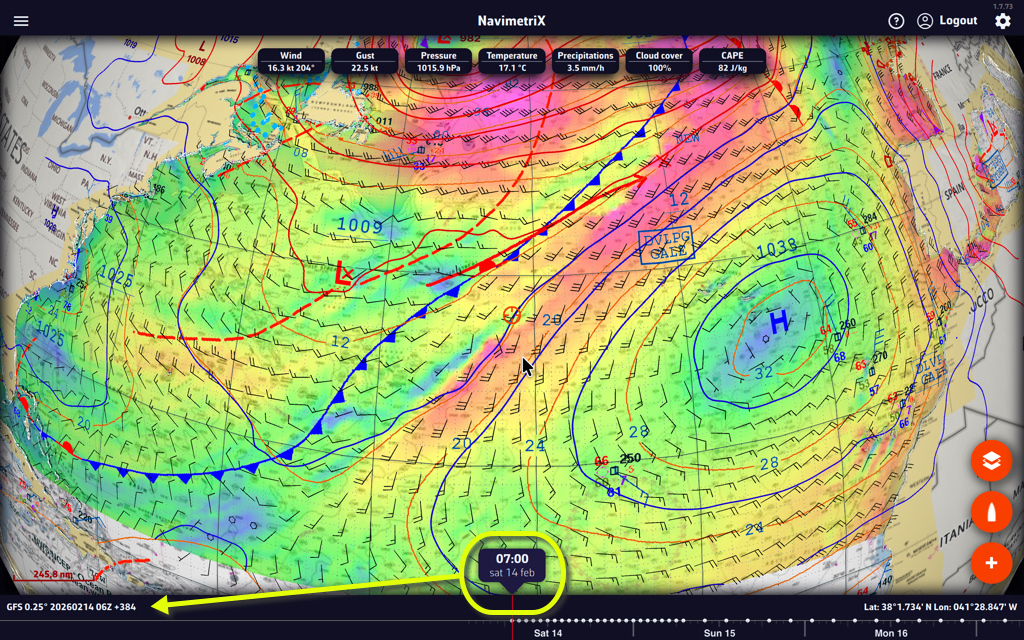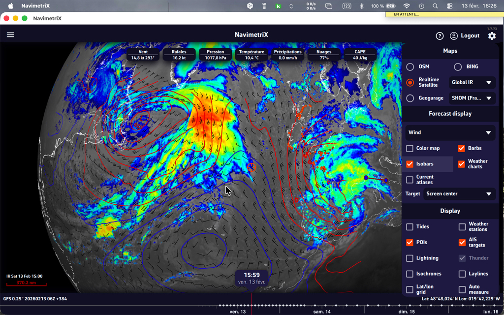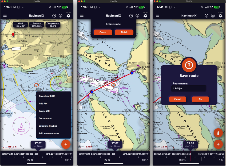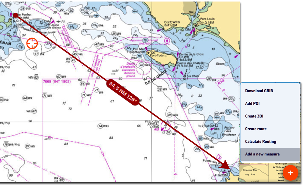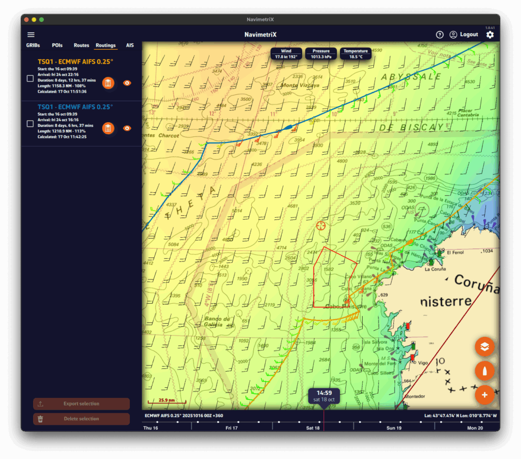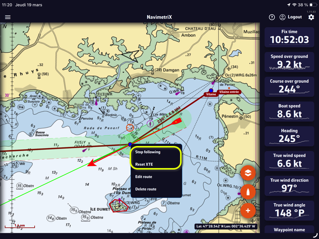 - If a routing is displayed, the boat moves at the selected time along its trajectory.