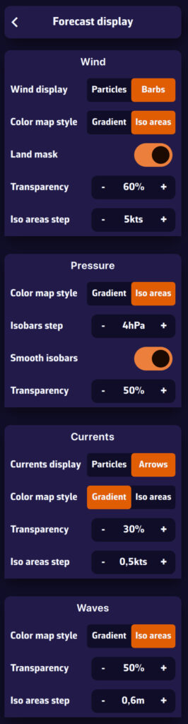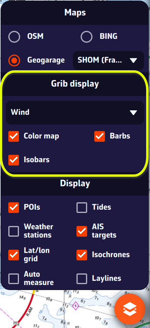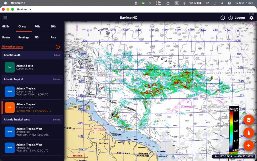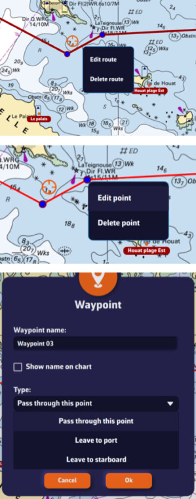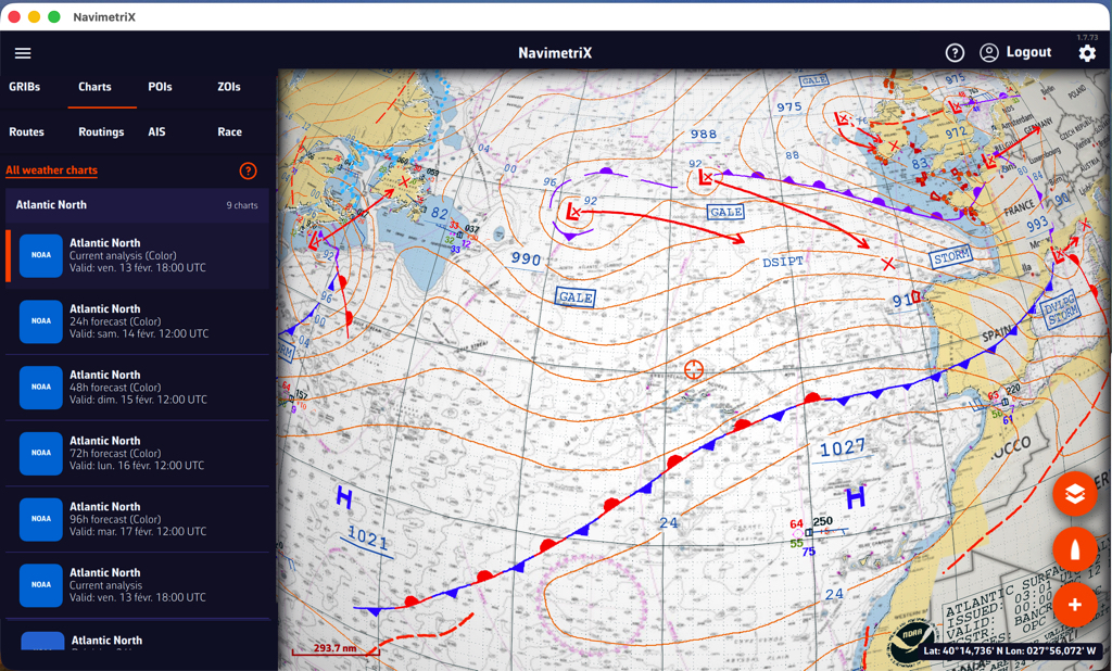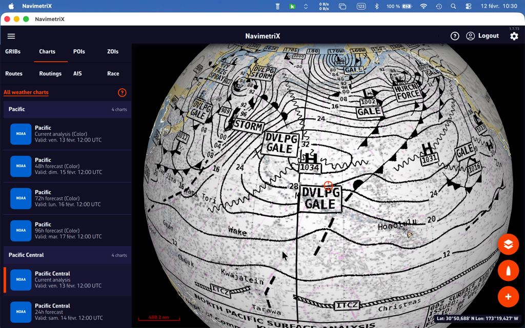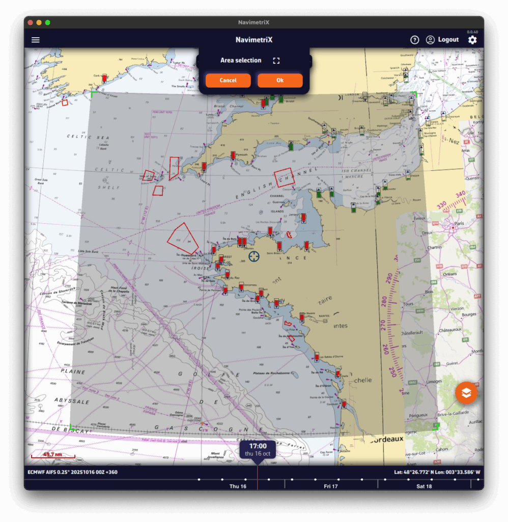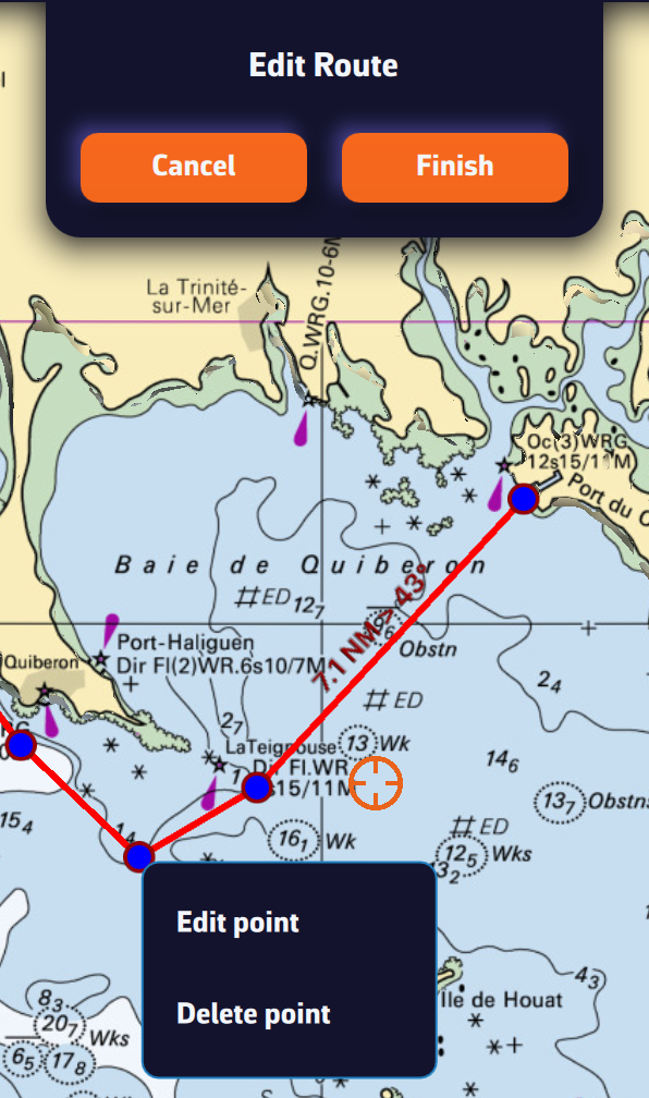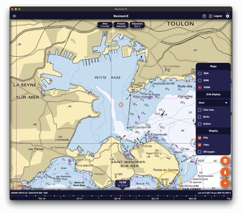 - If a routing is displayed, the boat moves at the selected time along its trajectory.