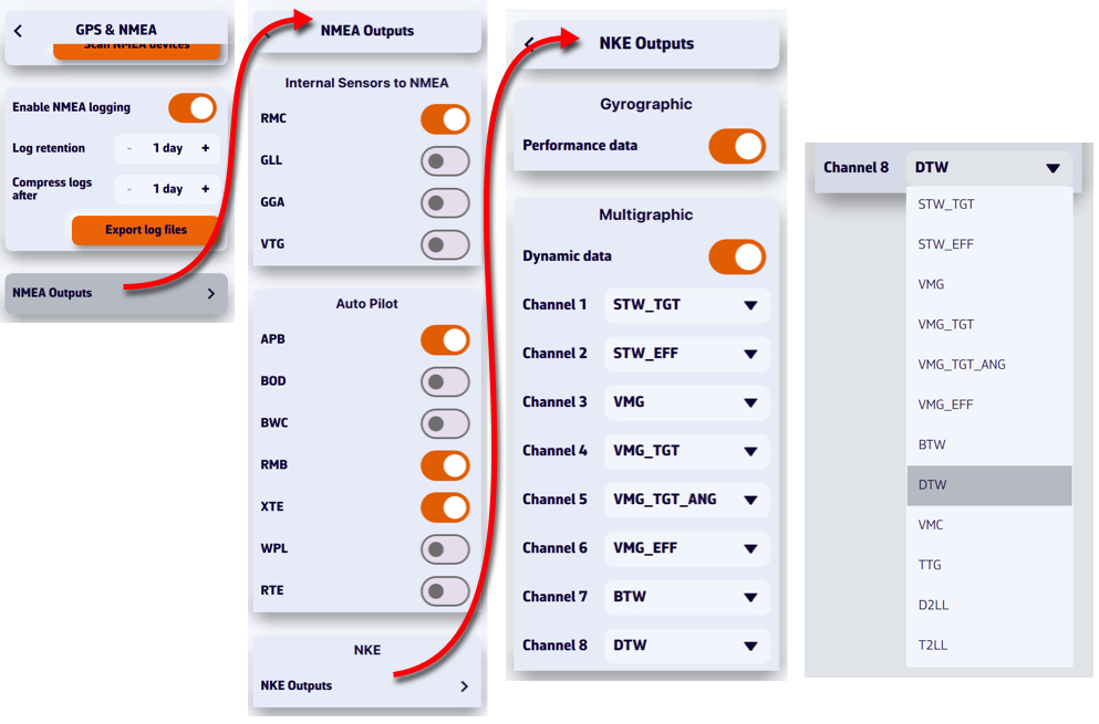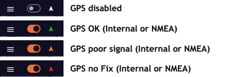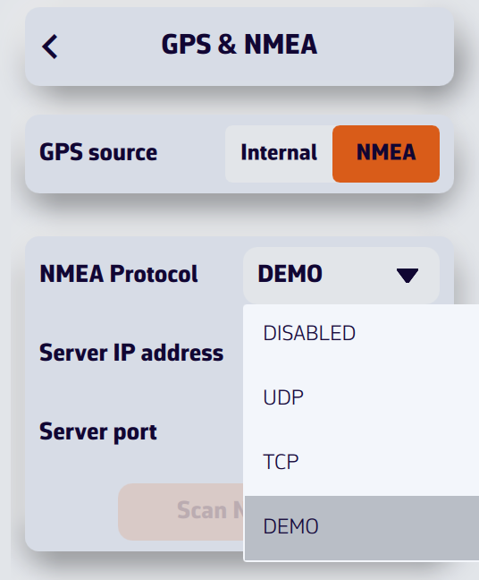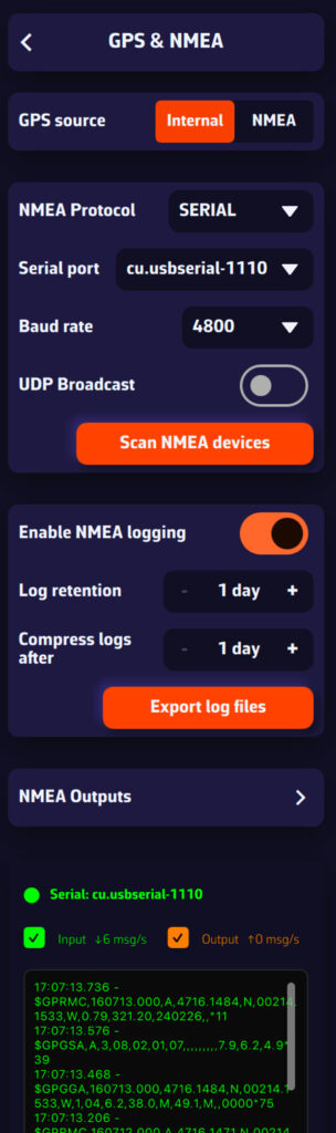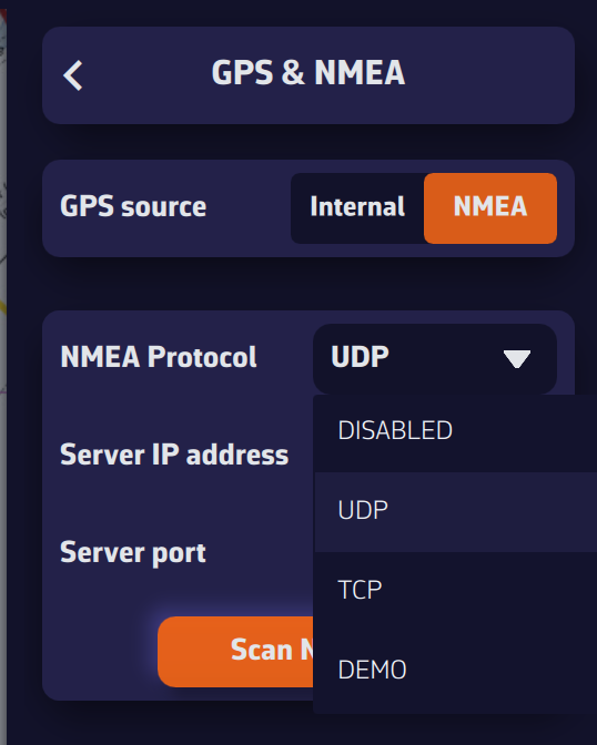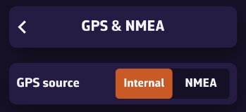 Open Settings by tapping the gear icon, then select GPS & NMEA. Once connected and data transmission enabled, select: