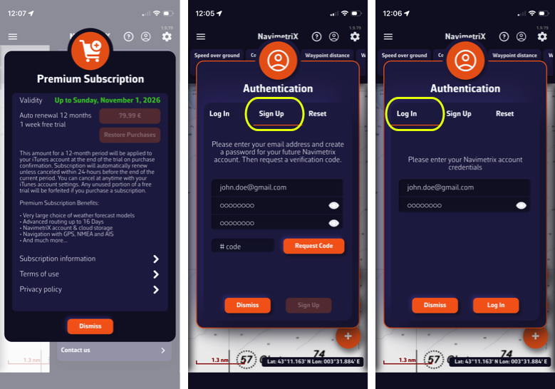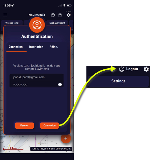 - đ€Account icon: allows you to log in to your NavimetriX account, create an account, or reset your password.
