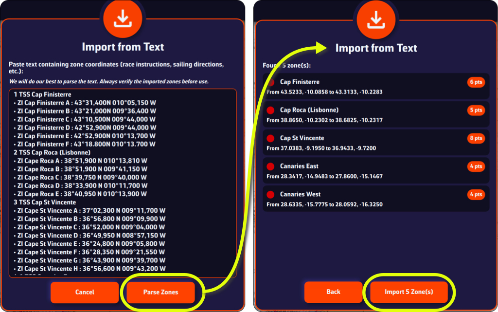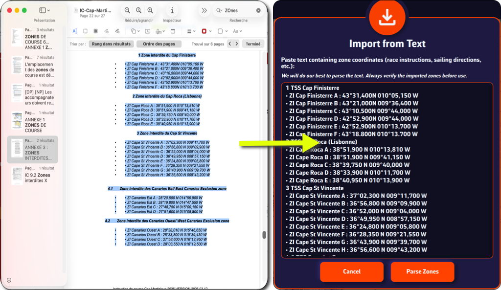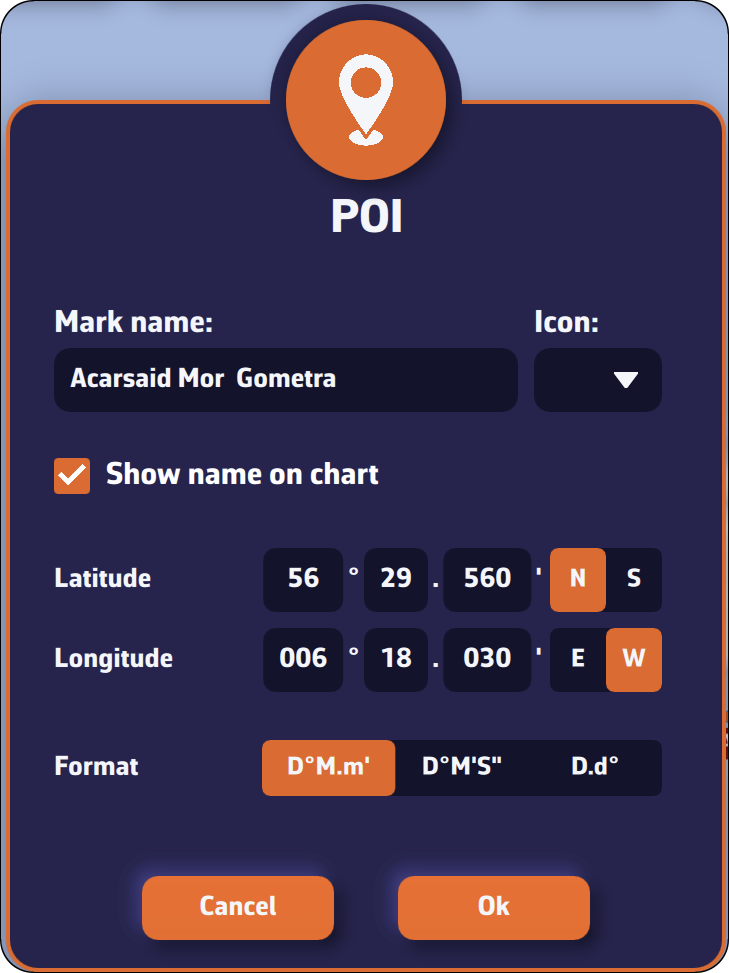 Important: Coordinates use the Adrena format (degrees.minutes), not decimal degrees. For example, 25.1873N means 25° 18.73' N (not 25.1873°).