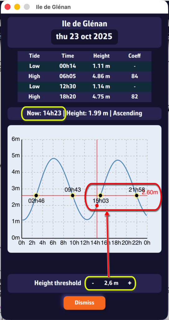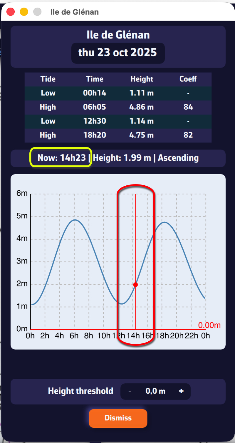 - Green : rising tide. Clicking on an icon opens the tide details with the times and heights calculated directly in the application.