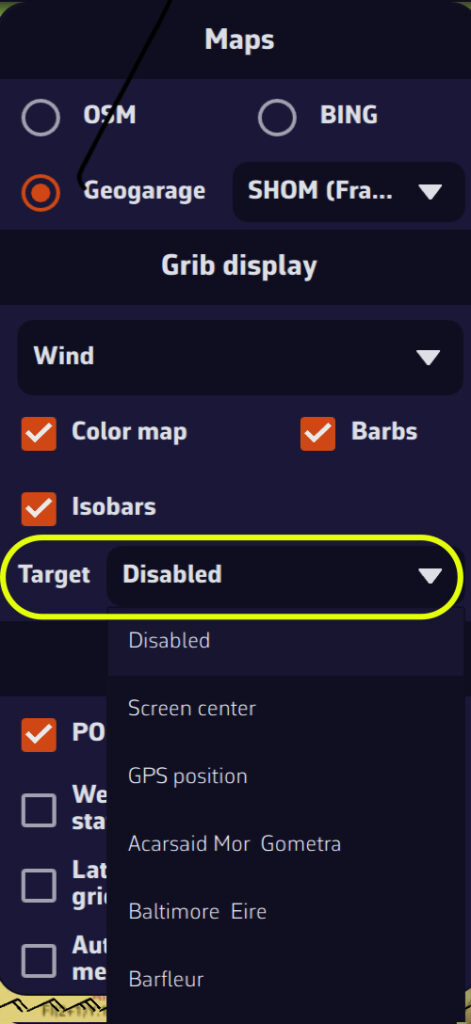 - Target (dropdown menu): Screen center (default), disabled, GPS location, POI.