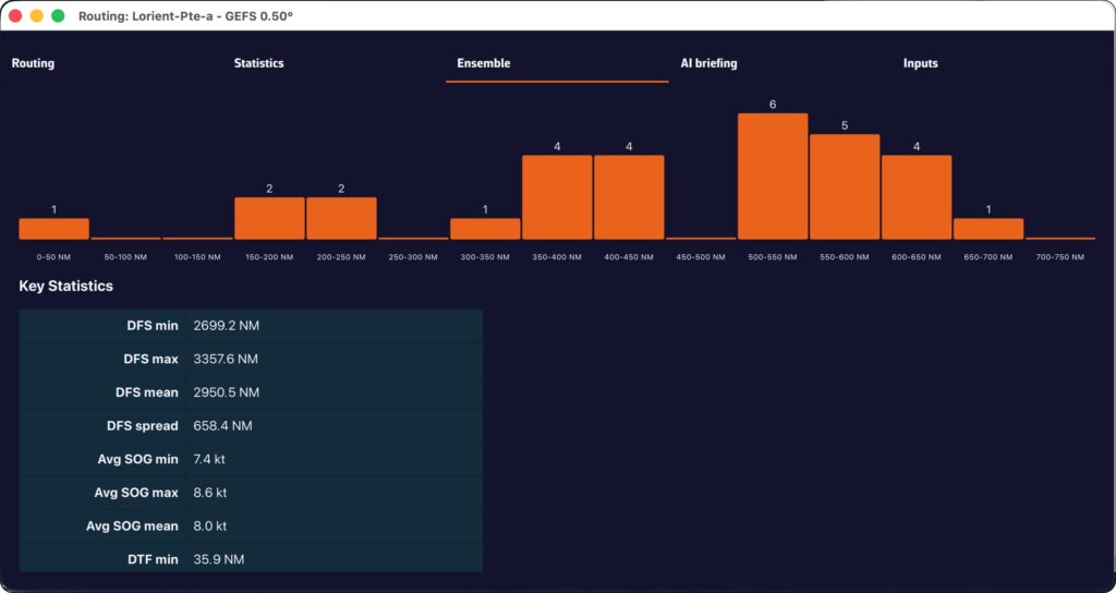 - DTF is calculated as the distance from each boat's current position to the finish, following the remaining waypoints